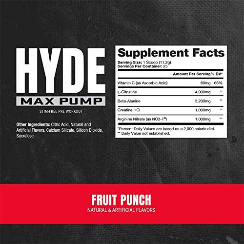 - Designed for MAXIMUM PUMP, strength and power, HYDE®Max Pump maximizes blood flow to carry essential nutrients to muscle tissue for increased volume, vascularity and performance. Now get more pump than you ever thought possible and in a stim-free pre workout, so you can take on its own, or stacked with another HYDE®preworkout for extreme performance.HYDE®Max Pump has 4,000mg of high quality L-Citrulline and 1,000mg of Arginine Nitrate (NO3-T™) for the development of plasma arginine which converts to Nitric Oxide for increased blood flow, maximum muscle pump and oxygen uptake.With increased blood flow to muscle tissue, HYDE®Max Pump also contains 3,200mg of Beta-Alanine to help push past the point of exhausting for more reps, and Creatine HCl for increased muscle volume. †