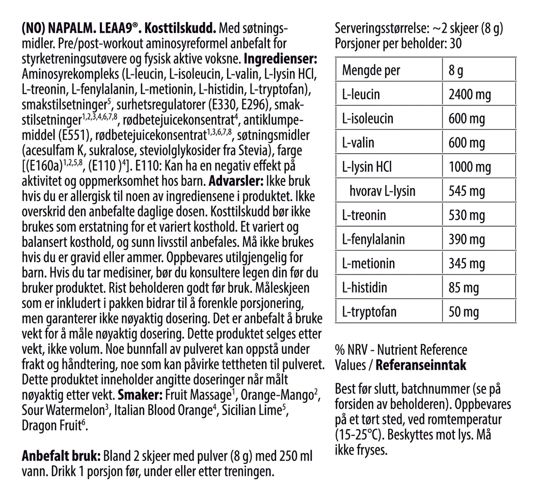 NAPALM LEAA 9 er et kosttilskudd som beriker det daglige kostholdet med eksogene EAA-aminosyrer, hentet fra høykvalitets fermenterte plantematerialer.