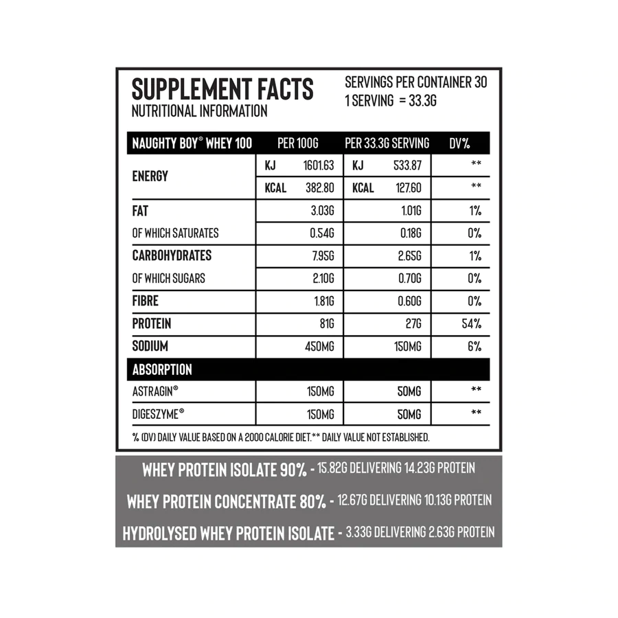 NaughtyBoy® Whey 100 er en kombinasjon av Whey Protein Isolate, Whey Protein Concentrate og Hydrolysed Whey Protein Isolate. Mange før oss har brukt den samme blandingen, men vi har gått et skritt videre.NaughtyBoy ® Whey 100 tilbyr en 100% gjennomsiktig etikett, noe som betyr at du vet nøyaktig hva du får i hver scoop!