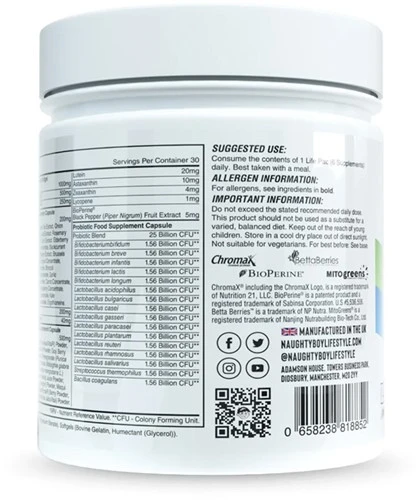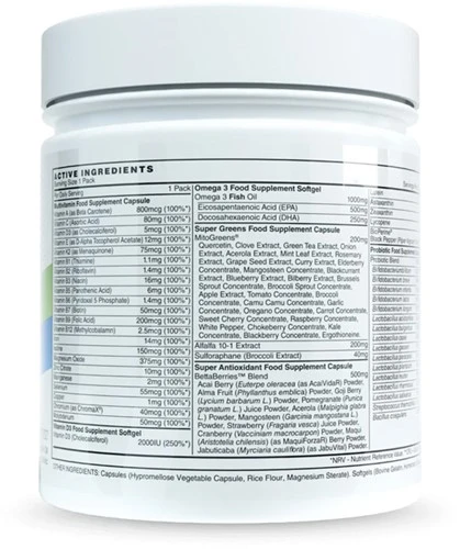 Life Pac inneholder over 80 aktive ingredienser inkludert patenterte ingredienser MitoGreens®, BettaBerries®, ChromaX® og til slutt BioPerine® for maksimal absorpsjon.