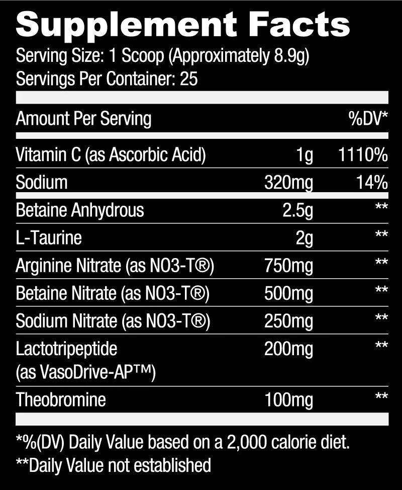 Også vannfri betain, L-taurin og teobromin for å hjelpe til med å maksimere treningsytelsen.