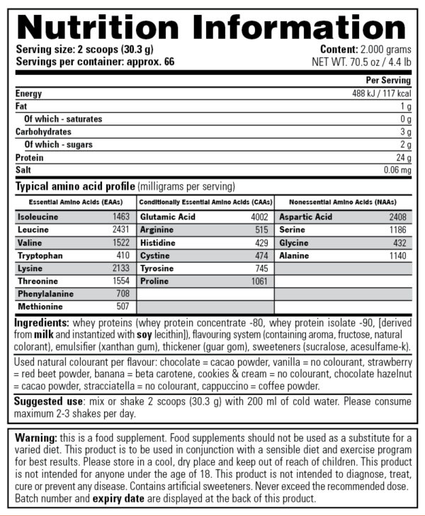 100% Whey is the showcase product of Stacker2 Europe’s sports nutrition line. 24 grams of protein in 30 grams of powder create a protein percentage of almost 80%, and this protein percentage is entirely made up of whey. 100% Whey is the best protein with the highest biological value. Both professional athletes and regular users are full of praise for our 100% Whey product quality. Finally, there’s a protein shake on the market that dissolves completely, tastes great when mixed with water and contains no added sugar nor aspartame.