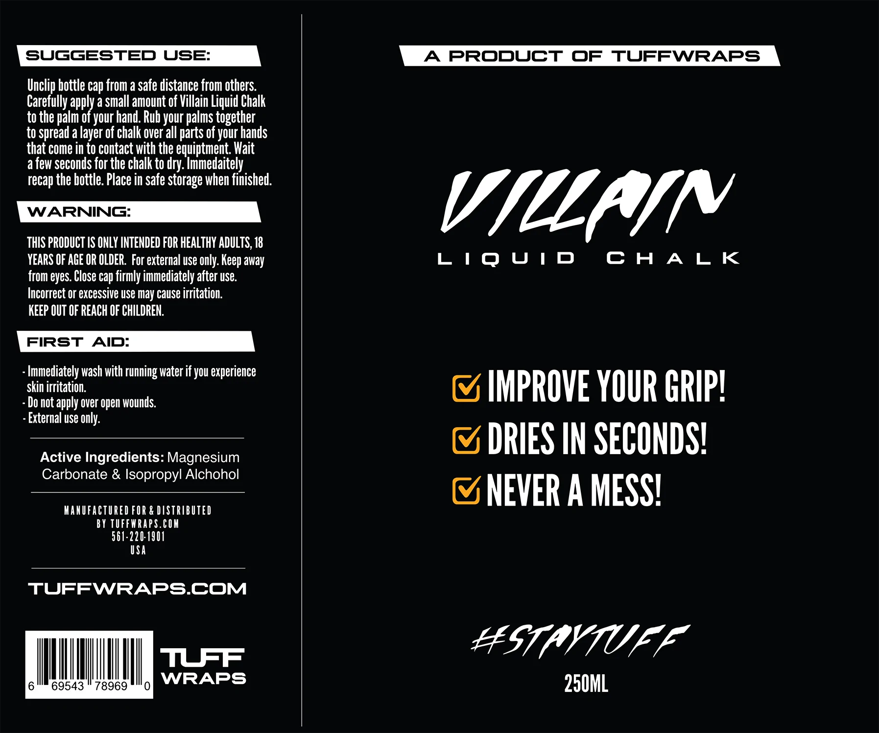 Villain flytende kritt er designet for å være en brukervennlig løsning for å gi ekstra grep for hendene dine. Det flytende krittet legges som et lag til hendene dine og lar deg gripe treningsutstyr (eller gjenstander) med selvtillit. Chalk vil ikke gni av med svette, og på grunn av sin flytende form blir det ikke bortkastet som vanlig kritt når du prøver å bruke det. En mye ryddigere løsning!